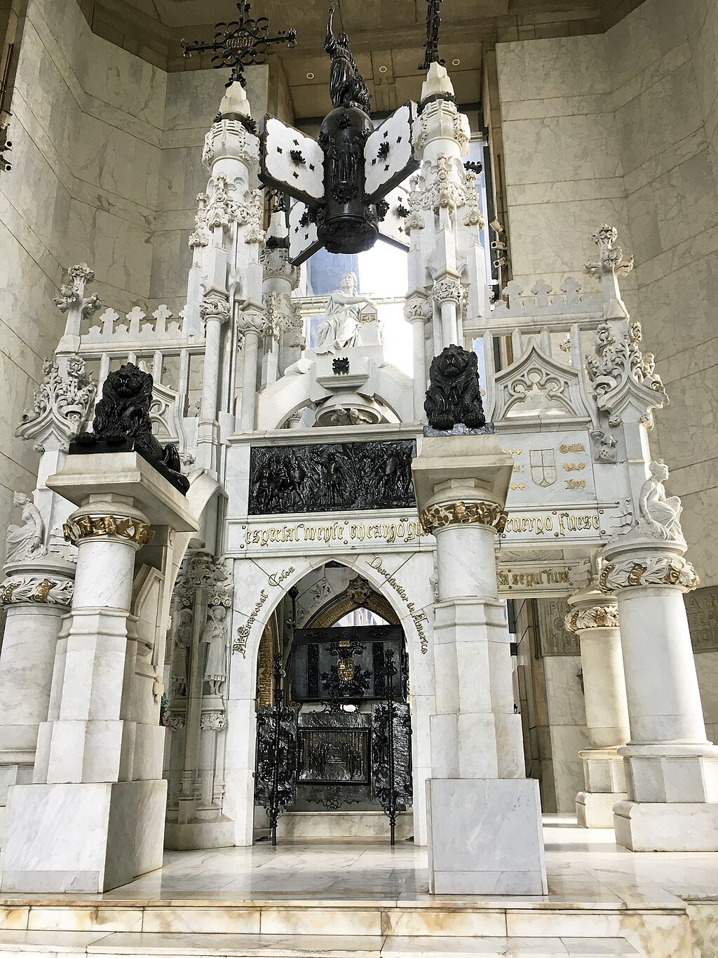 Fallecimiento, entierro y posteriores traslados![]() Muerte de Cristóbal Colón en una pintura de mediados del siglo xix de Francisco Ortego que forma parte de la colección del Museo del Prado. Cristóbal Colón falleció en Valladolid, el 20 de mayo de 1506, presumiblemente por complicaciones derivadas de una gota o una artritis padecida durante años.[285] Tras su muerte, su cuerpo fue tratado con un proceso llamado descarnación, mediante el cual se quitaba toda la carne de los huesos para la mejor conservación del cadáver. Se lo enterró inicialmente en el Convento de San Francisco en Valladolid y, posteriormente, sus restos fueron trasladados a la capilla de Santa Ana del Monasterio de la Cartuja en Sevilla en 1509.[167] Se encargó del traslado el mercader florentino Simón Verde, amigo de la familia.[286] En 1523, por deseo de su hijo Diego Colón, este dispuso en su testamento que tanto sus restos como los de su padre fueran trasladados y enterrados en la catedral de Santo Domingo. Los trámites relacionados con el cumplimiento de la voluntad testamentaria de Diego Colón estuvieron a cargo de su viuda, la virreina María Álvarez de Toledo y Rojas, quien a través de los buenos oficios de la reina Isabel, solicitó y obtuvo del rey Carlos I de España la autorización para que en la capilla mayor de la catedral de Santo Domingo fueran trasladados y enterrados Cristóbal y Diego Colón. María, el 2 de junio de 1537, amplió el derecho a favor de su hijo Luis Colón. ![]() Tumba de Cristóbal Colón. Catedral de Sevilla. Existen discrepancias sobre la fecha exacta en que María de Toledo trasladó los restos, ya que en 1536 la virreina solicitó a los monjes del monasterio cartujo de Santa María de la Cuevas de Sevilla la entrega de los restos de ambos almirantes, otras fuentes mencionan que el traslado de los restos se efectuó antes de 1539[287] y otras, que la virreina María Álvarez de Toledo los llevó consigo en su regreso a Santo Domingo el 8 de agosto de 1544.[288] Lo que resulta indubitable es que en 1548, cuando María redactó su testamento, los restos de ambos personajes ya estaban en la dicha catedral, ya que María pidió que su cuerpo no fuera enterrado en la misma sepultura de su marido Diego sino debajo de él, en el suelo de la capilla, junto al presbiterio del altar mayor. Los restos mortales de Cristóbal Colón permanecieron sepultados en Santo Domingo por más de dos siglos. Tras la conquista de la isla de Santo Domingo en 1795 por los franceses, se trasladaron a La Habana y, tras la guerra de independencia cubana en 1898, sus restos fueron trasladados a bordo del crucero Conde de Venadito hasta Cádiz y desde allí hasta Sevilla por el aviso Giralda con destino a la catedral de Sevilla,[289][290] donde reposan en un suntuoso catafalco. |