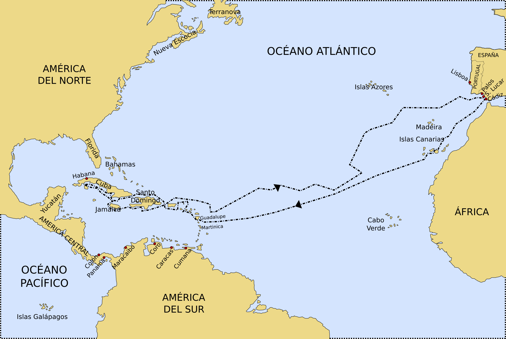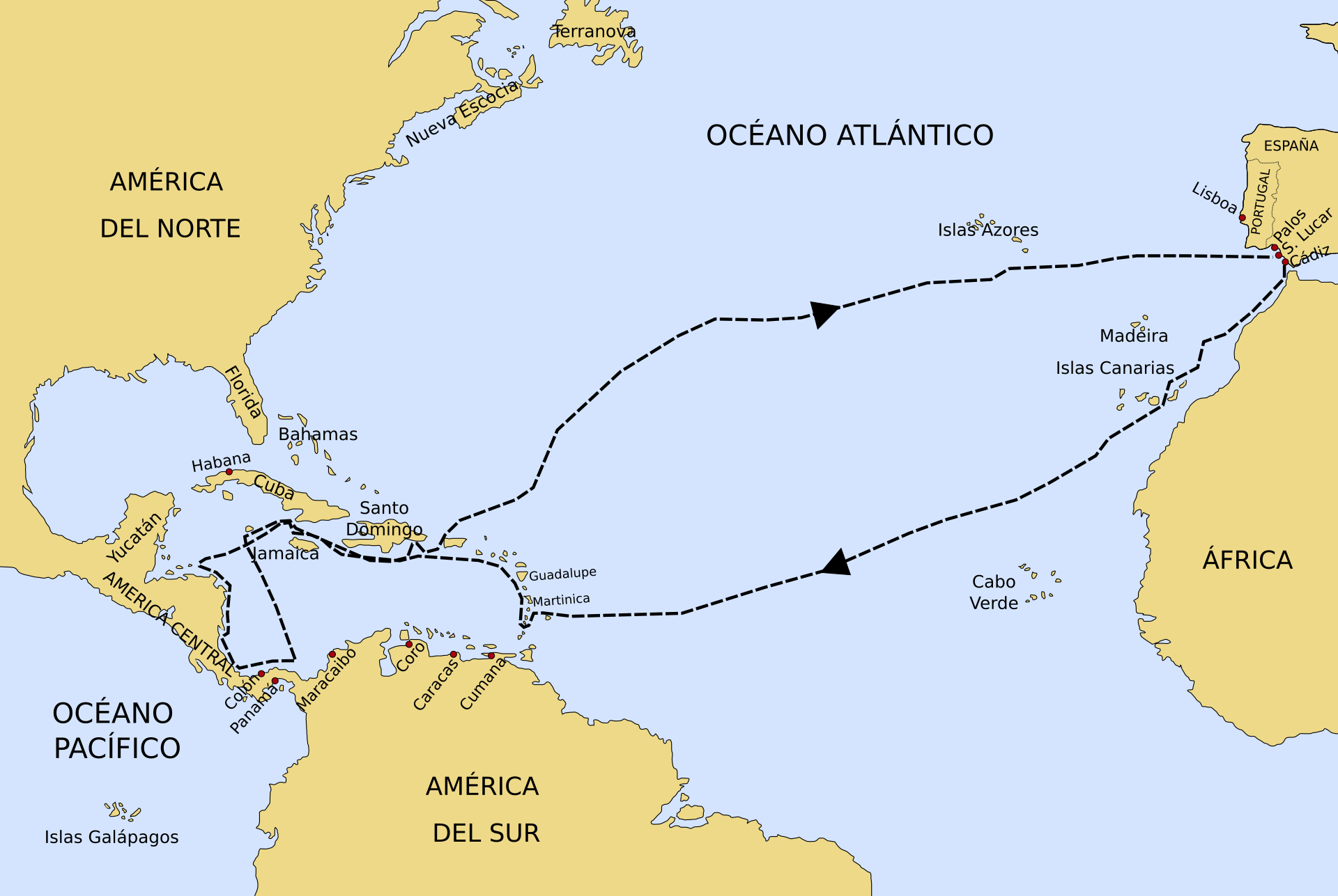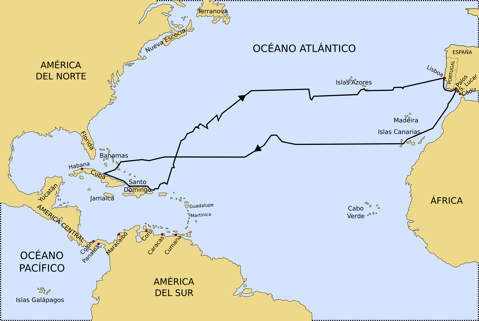 最初の遠征は1492年8月3日にパロス・デ・ラ・フロンテーラ(ウエルバ)の港から出発し、同年10月12日にグアナハニ(現在のバハマ諸島)に到着し