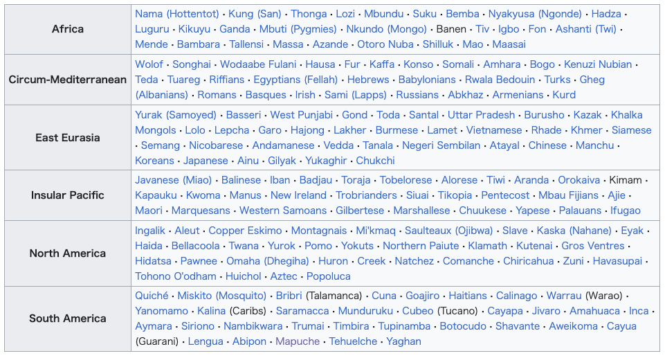異文化比較 人類学者が民族中心主義と戦う一つの手段は、異文化比較のプロセスに取り組むことだ。いわゆる「人類の普遍性」を民族誌的記録と照らし合わせて検証するこ とが重要である。例えば一夫一婦制はしばしば普遍的人類的特性として喧伝されるが、比較研究によればそうではない。ヒューマン・リレーションズ・エリア・ ファイルズ社(HRAF)はイェール大学に拠点を置く研究機関である。1949 年以降、同機関の使命は過去と現在の人類の文化・社会・行動に関する世界的な比較研究を促進・支援することにある。名称は当時イェール大学に存在した学際 的プログラム/施設「人間関係研究所」に由来する。同研究所は人類行動と文化の統合的科学構築の一環として、HRAFの前身である「異文化調査」(ジョー ジ・ピーター・マードック参照)を後援していた。ウェブ上の2つのeHRAFデータベースは毎年拡充・更新されている。eHRAF World Culturesは過去と現在の文化に関する資料を含み、約400の文化を網羅する。もう一つのデータベースeHRAF Archaeologyは主要な考古学的伝統と、さらに多くのサブ伝統や世界中の遺跡を扱う。 文化間比較の対象には、工業化(あるいは脱工業化)された西洋社会も含まれる。より伝統的な小規模社会からなる標準的な比較文化サンプルに含まれる文化は次の通りである: |