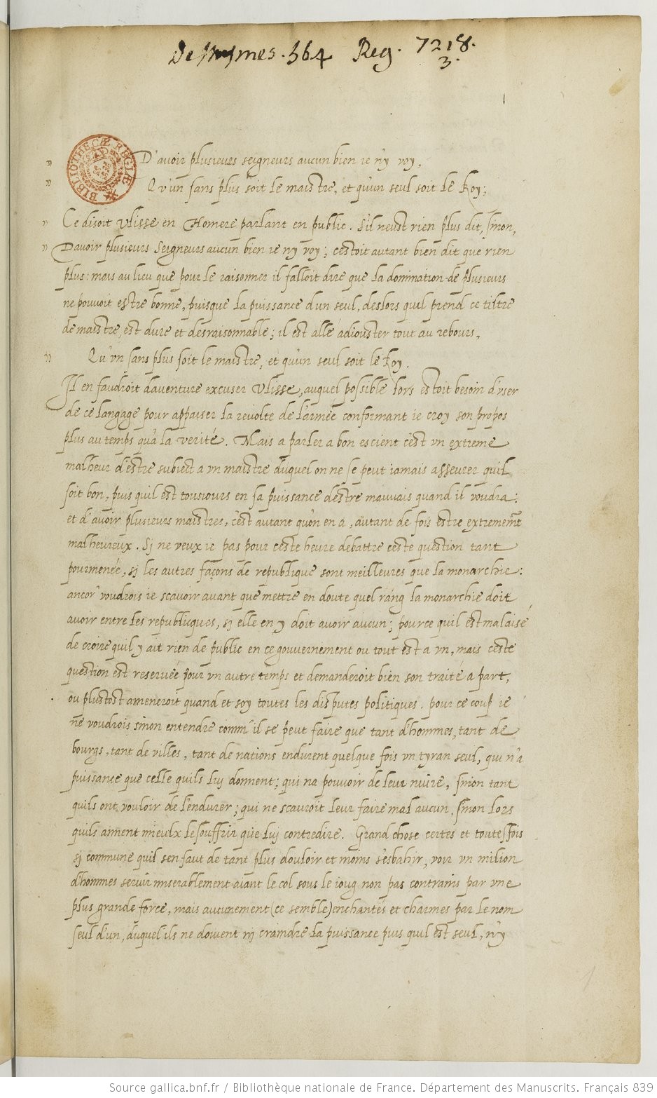 | Le texte de la Servitude volontaire Manuscrits É. de La Boétie, Discours de la Servitude volontaire (manuscrit de Robert Beale [Add. MS. 48043]), Londres, British Library, 157? (lire en ligne [archive]) É. de La Boétie, Discours de la Servitude volontaire (manuscrit de Mesmes), Paris, Bibliothèque nationale de France, 157? (lire en ligne [archive]) É. de La Boétie, Discours de la Servitude volontaire (manuscrit Mériadeck [Ms. 2199]), Bordeaux, Bibliothèques Virtuelles Humanistes, 1605 (lire en ligne [archive]) Premières éditions imprimées dialogi I. et II.,1574: [1] [archive]:[dialogus secundus vue 147 p.1 argumentum et titre vue 148 p.2 reprises dans les mémoires p.127 à 134] dialogues I. et II.in "réveille-matin...", 1574: [2] [archive] [dialogue second: vue199 p.1, argument et titre: p.2 reprises dans les mémoires: p.180 à 190]. É. de La Boétie, « Discours de la Servitude volontaire », dans Simon Goulart, Mémoires de l'estat de France, sous Charles neufiesme…, t. 3, Meidelbourg, Heinrich Wolf, 1577a (lire en ligne [archive]) É. de La Boétie, « Discours de la Servitude volontaire », dans Odet de La Noue, Vive description de la tyrannie, & des tyrans, avec les moyens de se garentir de leur joug, Reims, Jean Mouchar, 1577b (lire en ligne [archive]) Éditions modernes É. de La Boétie, « Discours de la Servitude volontaire », dans Michel de Montaigne, Essais, t. 5 (édition Pierre Coste), Genève, M. M. Bousquet & Comp., 1727 (lire en ligne [archive]), p. 74 à 136 É. de La Boétie, Discours de la Servitude volontaire ou le Contr'un, Bruxelles, Les Marchands de Nouveautés, 1836 (lire en ligne [archive]) É. de La Boétie, « Discours de la Servitude volontaire », dans É. de La Boétie, Œuvres complètes d'Estienne de La Boëtie (édition Léon Feugère), Paris, Jules Delalain, 1846 (lire en ligne [archive]) É. de La Boétie, « Discours de la Servitude volontaire », dans É. de La Boétie, Œuvres complètes d'Estienne de La Boétie (édition Paul Bonnefon), Bordeaux – Paris, G. Gounouilhou – J. Rouam, 1892 (lire en ligne [archive]) Éditions contemporaines É. de La Boétie (préf. Nadia Gontarbert), De la servitude volontaire ou Contr'un, Paris, Gallimard, coll. « TEL », 1993 É. de La Boétie (préf. Michel Magnien et Malcolm Smith), Discours de la Servitude volontaire ou Contr'un, Genève, Droz, coll. « Textes Littéraires Français », 2001 É. de La Boétie (préf. Tristan Dagron, postface Philippe Audegean, Tristan Dagron, Laurent Gerbier, Florent Lillo, Olivier Remaud et Luc Tournon), Discours de la Servitude volontaire, Paris, J. Vrin, coll. « Bibliothèque des textes philosophiques », 2002a (lire en ligne [archive]) É. de La Boétie (préf. Miguel Abensour et Marcel Gauchet, postface Pierre Clastres et Claude Lefort), Discours de la servitude volontaire, Paris, Payot, coll. « Petite Bibliothèque Payot », 2002b É. de La Boétie (préf. Tristan Dagron, postface André Tournon), Discours de la servitude volontaire, Paris, J. Vrin, coll. « Bibliothèque des textes philosophiques – Poche », 2014 É. de La Boétie (préf. Simone Goyard-Fabre, postface Raphaël Ehrsam, Laurent Gerbier et Michaël Boulet), Discours de la servitude volontaire, Paris, Flammarion, coll. « GF », 2016 É. de La Boétie (postface Séverine Auffret), Discours de la servitude volontaire, Paris, Mille et une nuits, coll. « 1001 nuits », 2021 É. de La Boétie (préf. Raoul Vaneigem), Discours de la servitude volontaire, Thervay, Exuvie, 2022 É. de La Boétie (préf. Arlette Jouanna, Francine Markovits et André Pessel, postface Miguel Abensour, Pascal Quignard et James C. Scott), Discours de la Servitude volontaire, Paris, Klincksieck, coll. « Critique de la politique », 2022 Éditions numériques É. de La Boétie, « Discours de la Servitude volontaire ou Contr'un [archive] » [PDF] (manuscrit de Mesme), sur Les Classiques des sciences sociales, 2010 É. de La Boétie, « Discours de la Servitude volontaire ou Contr'un [archive] » [PDF], sur singulier.eu (consulté le 24 novembre 2022) |