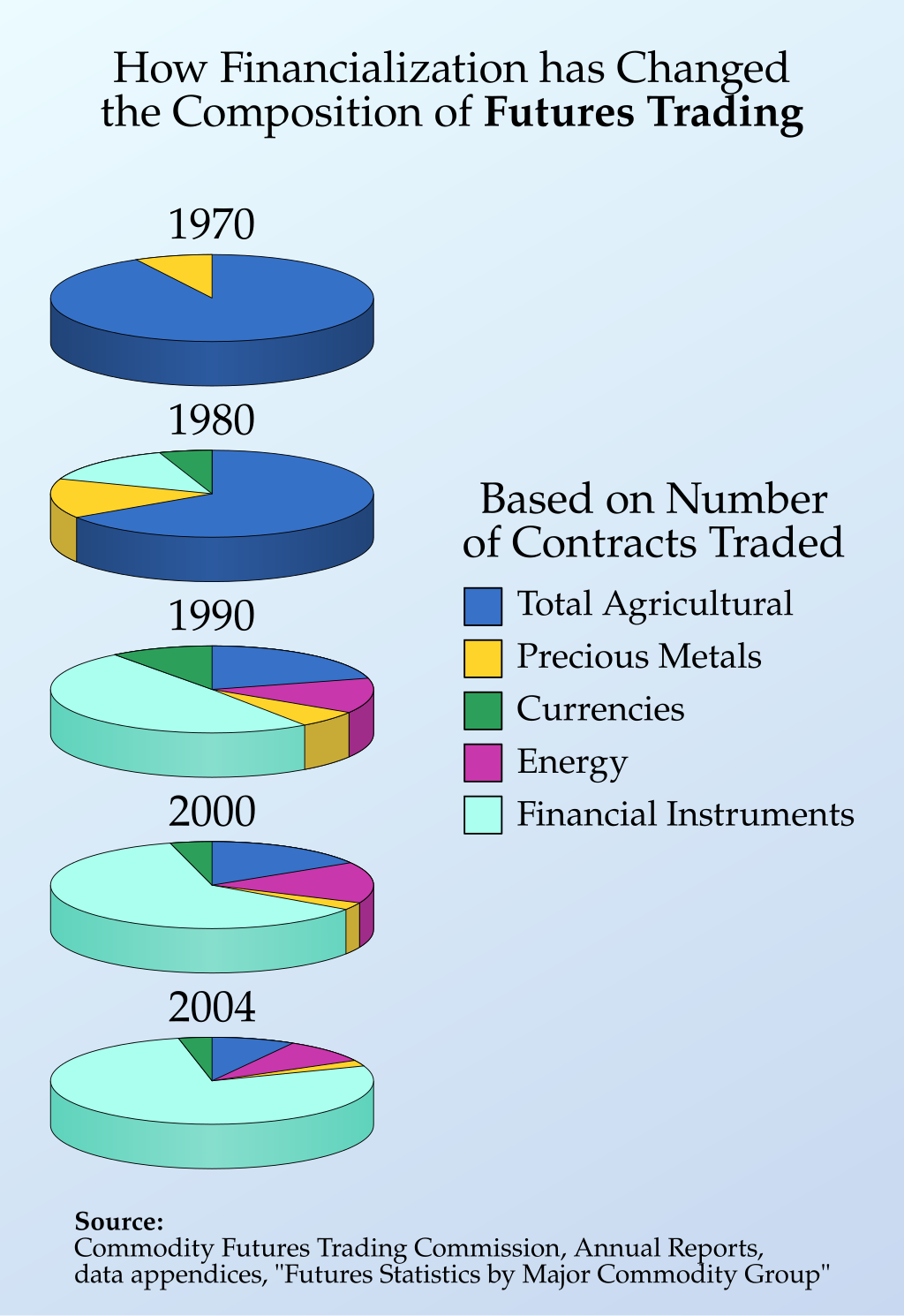 Futures markets![]() The data for turnover in the futures markets in 1970, 1980, and 1990 is based on the number of contracts traded, which is reported by the organized exchanges, such as the Chicago Board of Trade, the Chicago Mercantile Exchange, and the New York Commodity Exchange, and compiled in data appendices of the Annual Reports of the U.S. Commodity Futures Trading Commission. The pie charts below show the dramatic shift in the types of futures contracts traded from 1970 to 2004. For a century after organized futures exchanges were founded in the mid-19th century, all futures trading was solely based on agricultural commodities. However, after the end of the gold-backed fixed-exchange-rate system in 1971, contracts based on foreign currencies began to be traded. After the deregulation of interest rates by the Bank of England and then the US Federal Reserve in the late 1970s, futures contracts based on various bonds and interest rates began to be traded. The result was that financial futures contracts—based on such things as interest rates, currencies, or equity indices—came to dominate the futures markets. The dollar value of turnover in the futures markets is found by multiplying the number of contracts traded by the average value per contract for 1978 to 1980, which was calculated in research by the American Council of Life Insurers (ACLI) in 1981. The figures for earlier years were estimated on the computer-generated exponential fit of data from 1960 to 1970, with 1960 set at $165 billion, half the 1970 figure, based on a graph accompanying the ACLI data, which showed that the number of futures contracts traded in 1961 and earlier years was about half the number traded in 1970. According to the ALCI data, the average value of interest-rate contracts is around ten times that of agricultural and other commodities, while the average value of currency contracts is twice that of agricultural and other commodities. (Beginning in mid-1993, the Chicago Mercantile Exchange itself began to release figures of the nominal value of contracts traded at the CME each month. In November 1993, the CME boasted that it had set a new monthly record of 13.466 million contracts traded, representing a dollar value of $8.8 trillion. By late 1994, this monthly value had doubled. On January 3, 1995, the CME boasted that its total volume for 1994 had jumped by 54% to 226.3 million contracts traded, worth nearly $200 trillion. Soon thereafter, the CME ceased to provide a figure for the dollar value of contracts traded.) Futures contracts are "contracts to buy or sell a very common homogeneous item at a future date for a specific price." The nominal value of a futures contract is wildly different from the risk involved in engaging in that contract. Consider two parties who engage in a contract to exchange 5,000 bushels of wheat at $8.89 per bushel on December 17, 2012. The nominal value of the contract would be $44,450 (5,000 bushels x $8.89). But what is the risk? For the buyer, the risk is that the seller will not be able to deliver the wheat on the stated date. This means the buyer must purchase the wheat from someone else; this is known as the "spot market." Assume that the spot price for wheat on December 17, 2012, is $10 per bushel. This means the cost of purchasing the wheat is $50,000 (5,000 bushels x $10). So, the buyer would have lost $5,550 ($50,000 less $44,450), or the difference in the cost between the contract price and the spot price. Furthermore, futures are traded via exchanges, which guarantee that if one party reneges on its end of the bargain, (1) that party is blacklisted from entering into such contracts in the future, and (2) the injured party is insured against the loss by the exchange. If the loss is so large that the exchange cannot cover it, then the members of the exchange make up the loss. Another mitigating factor to consider is that a commonly traded liquid asset, such as gold, wheat, or the S&P 500 stock index, is extremely unlikely to have a future value of $0; thus, the counter-party risk is limited to something substantially less than the nominal value. |