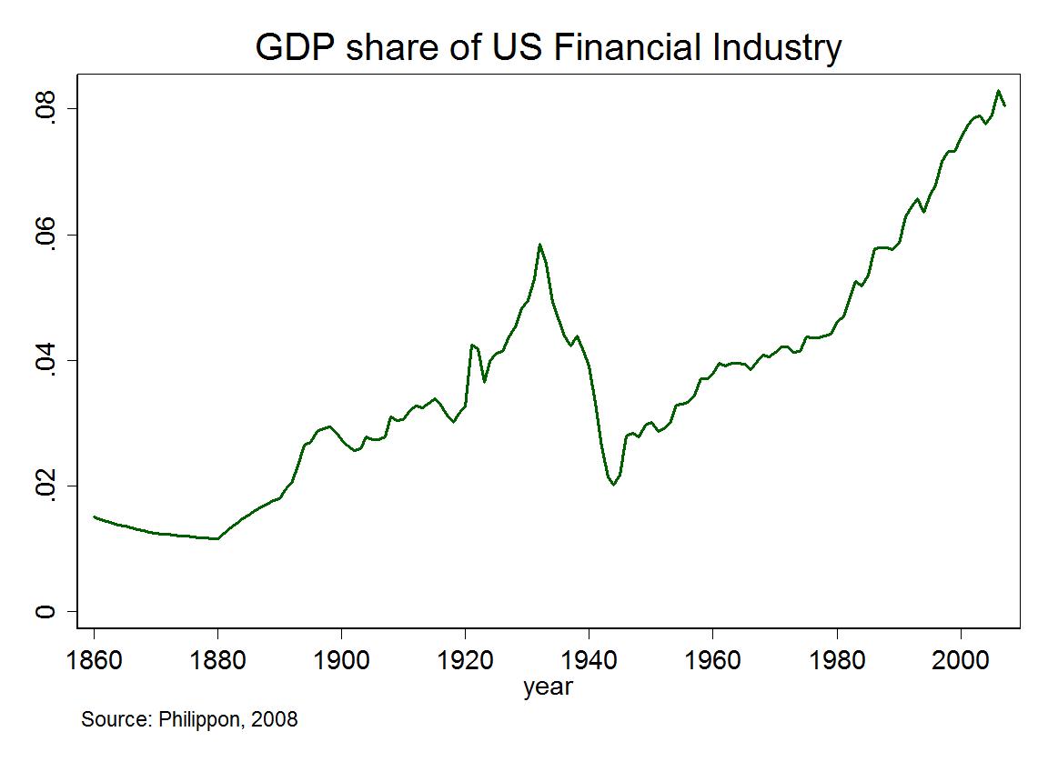 | Effects on the economy During the 2008 financial crisis, several economists and others began to argue that financial services had become too large a sector of the US economy, with no real benefit to society accruing from the activities of increased financialization.[22] In February 2009, white-collar criminologist and former senior financial regulator William K. Black listed the ways in which the financial sector harms the real economy. Black wrote, "The financial sector functions as the sharp canines that the predator state uses to rend the nation. In addition to siphoning off capital for its own benefit, the finance sector misallocates the remaining capital in ways that harm the real economy in order to reward already-rich financial elites harming the nation."[23] Emerging countries have also tried to develop their financial sector, as an engine of economic development. A typical aspect is the growth of microfinance or microcredit, as part of financial inclusion.[24] Bruce Bartlett summarized several studies in a 2013 article indicating that financialization has adversely affected economic growth and contributes to income inequality and wage stagnation for the middle class.[25] Cause of financial crises On 15 February 2010, Adair Turner, the head of Britain's Financial Services Authority, said financialization was correlated with the 2008 financial crisis. In a speech before the Reserve Bank of India, Turner said that the 1997 Asian financial crisis was similar to the 2008 financial crisis in that "both were rooted in, or at least followed after, sustained increases in the relative importance of financial activity relative to real non-financial economic activity, an increasing 'financialisation' of the economy."[26] |