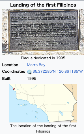 Spaniard and a Filipino.[2] Departing Morro Bay after the deaths of the crew members, the Nuestra Señora de Buena Esperanza eventually reached its intended destination of Acapulco.[3] No other Filipino was brought to California until 1595.[4] In 1995, a monument on Morro Bay was dedicated to commemorate the events of 1587.[5] October has been designated as Filipino American History Month since 2009 in recognition of these events.[6] ![]() |