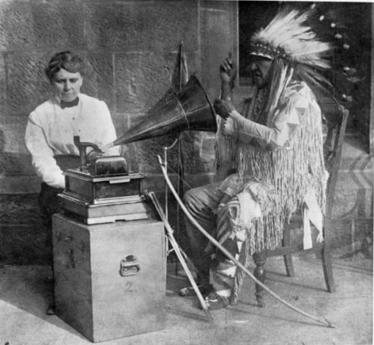 ![]() デンズモアは1916年、アメリカ民族学局の蓄音機録音セッション中にブラックフット族の首長マウンテン・チーフと共に行動した。 ![]() フランシス・デンスモアとマウンテン・チーフ(スー族)。チーフは録音内容を手話で通訳している。1914年。 |