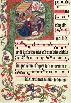 ![]() Der Weihnachts-Introitus Puer natus est in gregorianischer Quadratnotation. Choralbuch aus dem Klarissenkloster Bamberg (entstanden um 1500) |