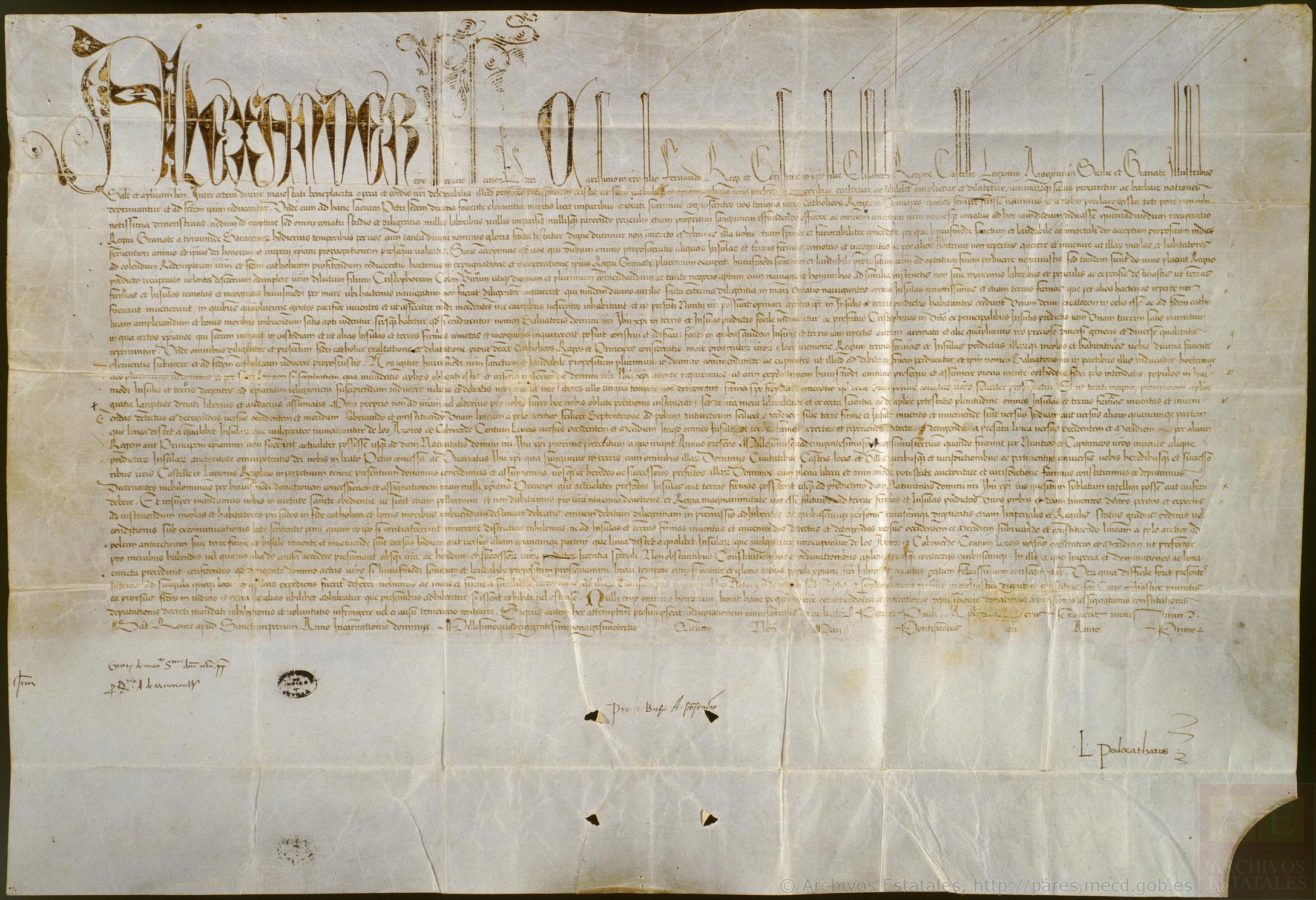 1493 en favor de Fernando e Isabel, reyes de Castilla y Aragón. La bula lleva fecha de 4 de mayo de 1493 pero se cree que realmente fue redactada más tarde, en el mes de junio. Su texto coincide en gran parte con el del breve Inter caetera del 3 de mayo de 1493, anterior a ella y que probablemente fue considerado insuficiente por los Reyes Católicos.[1] La novedad más importante que introdujo esta bula fue la definición de un meridiano al oeste del cual todas las tierras «halladas y por hallar» pertenecerían a los reyes de Castilla y Aragón. Esto supuso un cambio muy favorable para los Reyes Católicos respecto al breve Inter caetera, el cual había estipulado que pertenecerían a la Corona castellana sólo las tierras que fuesen descubiertas por navegantes castellanos.[2] Otros añadidos menores fueron una referencia más clara a tierras continentales (terras firmas) y unas palabras de elogio a Colón.[n. 1] Esta bula no menciona en ningún momento a Portugal y sólo se refiere al resto de los estados de la época al indicar que quedarían excluidos de la posesión castellana los territorios que ya perteneciesen a algún príncipe cristiano, al 25 de diciembre de 1492.[2] El manuscrito original de la bula promulgada se encuentra en el Archivo de Indias de Sevilla.[2] |