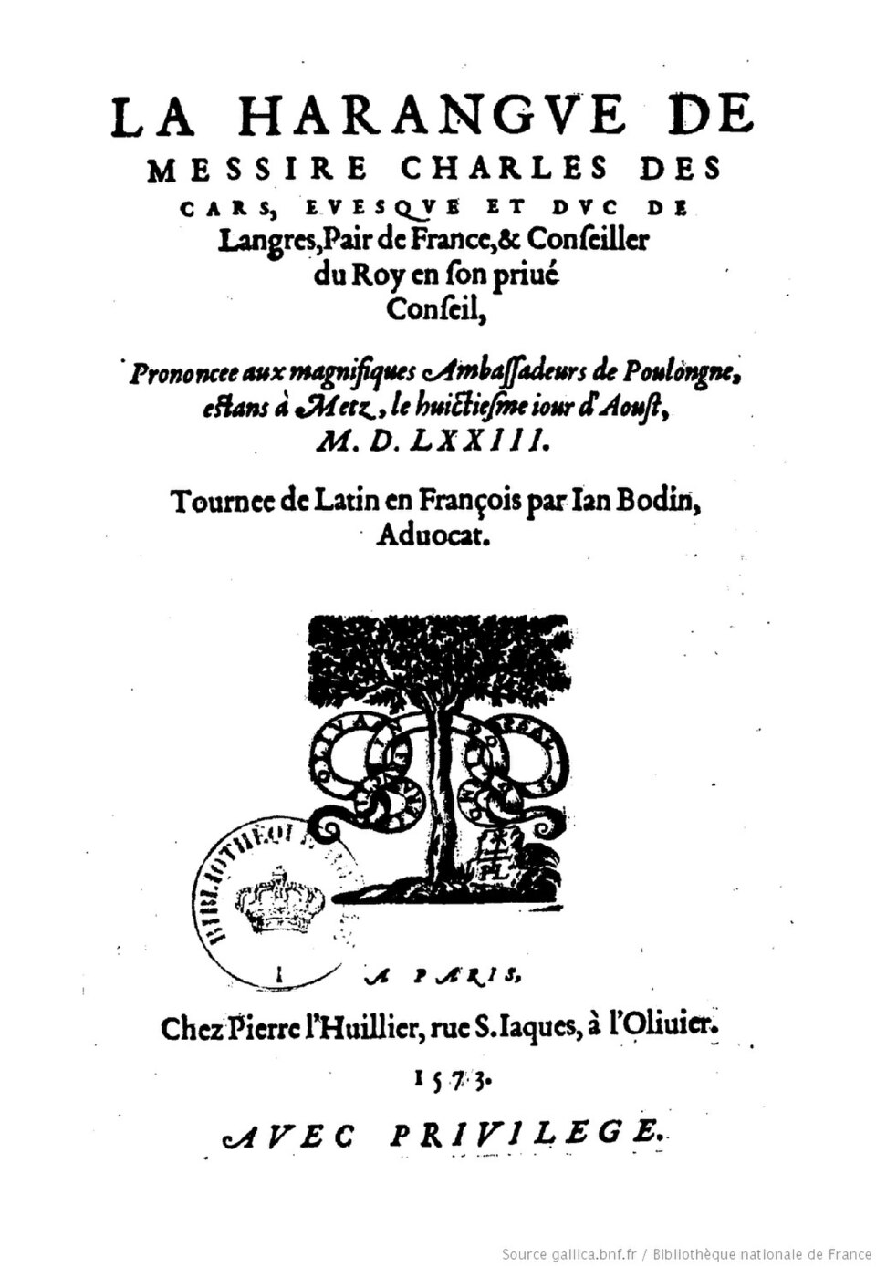 書誌 ジャン・ボダンの著書 ![]() ジャン・ボダンが、新国王アンリ3世を迎えるためにメスにやってきたポーランドの大使たちに向けて書いたスピーチ。1573年版 (la) Oppiani de Venatione libri IIII, Paris, Michel Vascosan, 1555, 110 p. (read online [archive]) 写本の部分が続く。 (la) Oratio de instituenda in repub. juventute ad senatum populumque Tolosatem, Toulouse, P. Puteus, 1559, 72 p.. (オンラインで読む[アーカイブ])。 (ラ)Methodus ad facilem historiarum cognitionem, Paris, M. Jeune, 1566, 492 p...... (オンラインで読む[アーカイブ]) Pierre Mesnard (ed.), Œuvres philosophiques de Jean Bodin, Paris, Presses universitaires de France, 1951, 473 p...... Discours au Sénat et au peuple de Toulouse; Juris universi distributio; Methodus ad facilem historiarum cognitionemのラテン語テキストと翻訳を含む。 Les paradoxes de M. de Malestroict [...] avec Réponse de Jean Bodin, Paris, 1568 (read online [archive]). Jean Bodin Discours de le rehaussement et diminution des monnoyes, Paris, Jacques du Puys, 1578, 149 p.... (read online [archive]). La harangue de messire Charles des Cars... prononcée aux magnifiques ambassadeurs de Poulongne, Paris, Pierre L'Huillier, 1573, 19 p.. (オンラインで読む[アーカイブ])。 Les Six Livres de la République, Paris, Jacques du Puys, 1576, 861 p.... (オンラインで読む [アーカイブ])。ウィキソース上のテキストも参照のこと (la) De republica libri sex, latine ab auctore redditi, multo quam antea locupletiores, cum indice locupletissimo, 1609 1586 (read online [archive]), 5th edition. Les six livres de la République, Paris, Arthème Fayard, 1986.全6巻。 ジャン・ボダン 共和国六部書. Un abrégé du textte de l'édition de Paris de 1583, Paris, Librairie générale française/Le Livre de poche, 1993, 607 p.... (ISBN 9782253063544) Recueil de all cei's negoté en la compagnie du tiers Estat de France, 1577, 142 p. (ISBN 978225303544). (オンラインで読む[アーカイブ])。 (la) Iuris universi distributio, Lyon, 1578 (1580), 51 p.. (read online [archive]). De la démonomanie des sorciers, Paris, Jacques du Puys, 1580, 613 p.... (read online [archive]). Apologie de René Herpin pour la République de Bodin, Paris, Jacques du Puys, 1581, 44 p.... (read online [archive]). (ラ) Sapientiae moralis epitome, Paris, J. du Puys, 1588 ボダン氏の手紙、トロワ、ジャン・モロー、1590年、14p. (オンラインで読む[アーカイブ])。 (la) Colloquium heptaplomeres: Des secrets cachez des choses sublimes entre sept scavans qui sont de differentrens sentimens, manuscript, 1593. ジャン・ボダンのコロキウム。Des secrets cachez des choses sublimes entre septre sçavans qui sont de differentérens sentimens [抜粋] (trans. Roger Chauviré), Paris, Champion, 1914, 229 p. (オンラインで読む[アーカイブ])。 François Berriot, Katharine Davies, Jean Larmat and Jacques Roger, Colloque entre sept scavants qui de differentrens sentimens des secrets cachets des choses relevees: Texte présenté et établi by F. Berriot, Genève, Droz, 1984, 591 p. (la) Universae naturae theatrum, Lyon, J. Roussin, 1596, 633 p. (オンラインで読む[アーカイブ])。 Le théâtre de la nature universelle: François de Fougerollesによるラテン語訳、Lyon, Jean Pillehotte, 1597, 942 p.... (read online [archive]). (ラ)イオ. Bodini Paradoxon. Quod nec virtus ulla in mediocritate nec..., Paris, Duval, 1596 (read online [archive]). アンジュー家のジャン・ボダンのパラドックス... Qu'il n'y a pas une seule vertu en médiocrité, ny au milieu deux vices, Paris, Duval, 1598, 100 p. (read online [archive]). Paradoxes de M. J. Bodin, doctes et excellents discours de la vertu (trans. Claude de Magdaillan), Paris, T. Du Bray, 1604. 引用文献 B. Barret-Kriegel, "Jean Bodin: de l'empire à la souveraineté. De l'état de justice à l'état administratif」, in Jean Bodin. Actes du colloque interdisciplinaire d'Angers, Angers, Presses de l'université d'Angers, 1985, pp.345-355. Henri Baudrillart, Bodin et son temps - Tableau des théories politiques et des idées économiques au xvie siècle, Paris, Guillaumin, 1853 (read online [archive]). 1964年に再版された。 Pierre Bayle, 「Notice sur Jean Bodin」, in Dictionnaire, 1740 (read online [archive]) ジェルマノ・ベルッシ「ジャン・ボダンとトマス・ホッブズの作品における政治的絶対主義と宗教的寛容」、『ジャン・ボダン』所収。Actes du interdisciplinaire colloque d'Angers, Angers, Presses de l'université d'Angers, 1985, pp.43-47. François Berriot, 「Le théâtre de la nature universelle ou le tableau du monde」, in Yves Charles Zarka, Jean Bodin. Nature, histoire, droit et politique, P.U.F., 1996, p. 3-22. François Berriot, 「Jean Bodin et l'Islam」, in Jean Bodin. Actes du colloque interdisciplinaire d'Angers, Angers, Presses de l'université d'Angers, 1985, pp.171-182. (Ann Blair, The Theater of Nature. Jean Bodin and Renaissance Science, Princeton, Princeton University Press, 1997, p. 382. (アン・ブレア、「ジャン・ボダンにおける著者の戦略」、『ボダンの受容』、ブリル、2013年、137-156頁。 (en) Harald Braun, 'Making the Canon: The Early Reception of the Republique in Castilian Political Thought. In The European Reception of Bodin」, in Howell A. Lloyd, The Reception of Bodin. Lloyd, The Reception of Bodin, vol. 223, Brill's Studies. 223, Brill's Studies in Intellectual History Online, 2013, pp. Roger Chauviré, Jean Bodin, auteur de 「 La République 」, Paris, Champion, 1914, 564 p.... (オンラインで読む[アーカイブ])。付録:ボダンからヤン・ボートル・デ・マトラ(1583年)、モーヴィシエール(1585年)、アイロー、ローラ ン・ビニョンへの書簡の複製。 Francis Cl