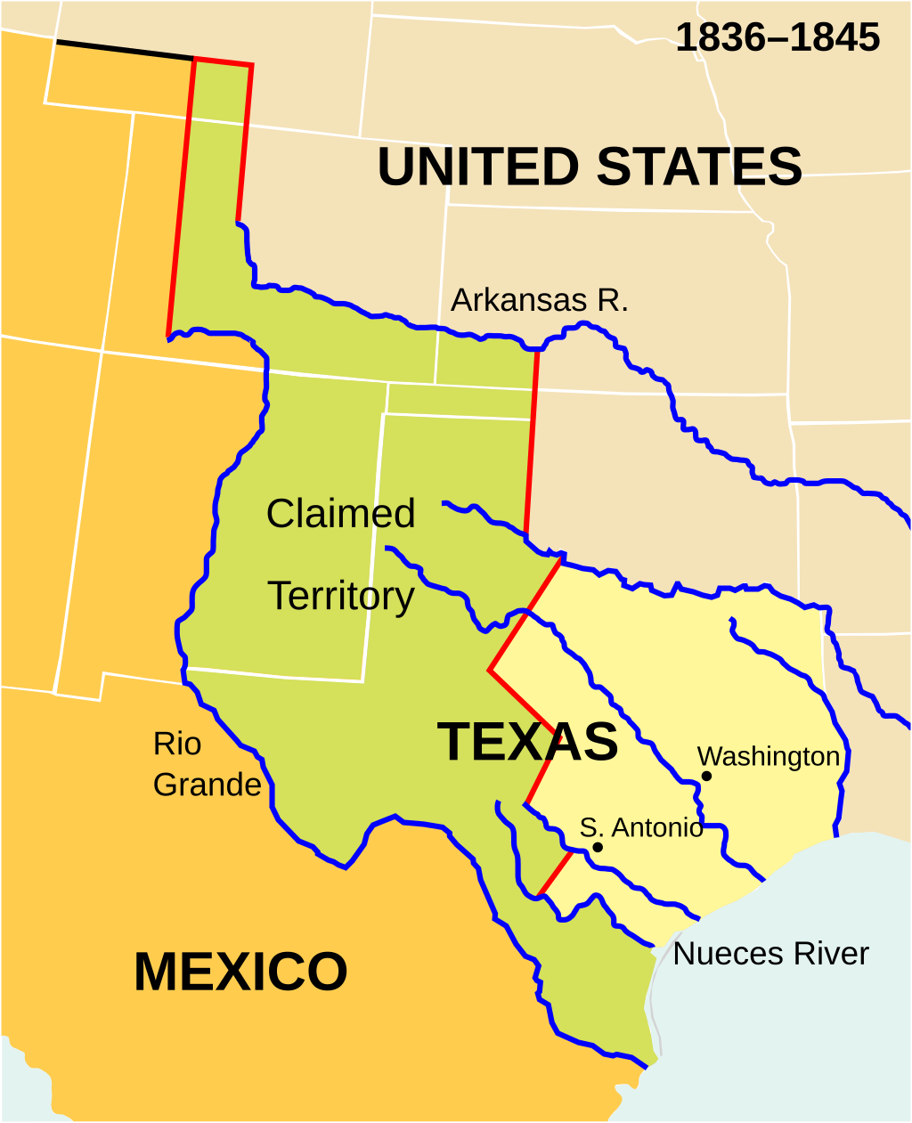 経緯 米国における状況 米国政府は、アグスティン・デ・イトゥルビデの治世以来、上カリフォルニアの買収を試みてきたが、この要求はメキシコによって何度も拒否され、両国の関係 を大きく悪化させていた。[1] ジョン・クインシー・アダムズ大統領とアンドリュー・ジャクソン大統領の在任中、米国はメキシコにテキサスの買収を2度提案したが、いずれも失敗に終わっ た。1836年、テキサスに住む35,000人以上の米国人がメキシコからの独立を宣言し、テキサス共和国を樹立すると、メキシコ政府は米国が支援する国 内での反乱を鎮圧した。軍隊の投入は失敗に終わり、テキサスは独立を達成した。しかし、その後、テキサスの南と西のメキシコとの国境は、係争地となった。 ![]() ジェームズ・K・ポーク大統領、マシュー・ブレイディ撮影、1849年 1842年10月19日、トーマス・アプ・ケイツビー・ジョーンズ提督は、メキシコとの戦争が勃発したと信じて、カリフォルニア州モントレーを占領した が、10月20日にその情報とは異なる情報を受け、撤退した。この事件と、その直後にサンディエゴで発生した同様の事件を受けて、メキシコの外務大臣ホ セ・マリア・ボカネグラは、国際法の違反および米国による敵対行為であると判断し、厳しい抗議の書簡を送った。[4] 1844年の大統領選挙では、ジェームズ・K・ポークが民主党の候補者として出馬し、マニフェスト・デスティニーという観点から大規模な拡張政策を掲げて大統領に選出された。選挙直後、彼はテキサスの米国への併合を推進した。[5] 1845年2月19日にテキサス共和国が米国に加盟すると、リオ・グランデ川が南部と西部の国境であるとの主張は、テキサス州から米国に引き継がれた。し かし、この主張は決して確固たるものではなかった。メキシコ統治下では、テキサス州とコアウイラ州の境界はヌエセス川であった。メキシコ側は、テキサスの 独立後もヌエセス川が国境であると主張した。[6] 米国でも、リオ・グランデ川を国境とする要求は議論の的となった。ジェームズ・ブキャナン国務長官でさえ、この主張には疑問を抱いていた。[7] |