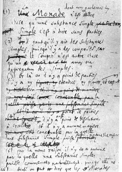 テキスト![]() 『モナドロジー』の最初の原稿ページ 1712年から1714年9月までのウィーン滞在中、ライプニッツは自身の哲学を簡潔に説明したフランス語の短文を二篇書いた。死後、サヴォイア公ユージ ン宛てに書かれた『理性に基づく自然と恩寵の原理』がオランダでフランス語版として出版された。クリスティアン・ヴォルフらは第二の文章をドイツ語とラテ ン語に翻訳し、これが後に『単子論』として知られるようになった。彼らはオランダ語版の『自然および恩寵の原理』を目にしていなかったため、このフランス 語文書が『単子論』の原典だと誤認した。実際、ドイツ語訳は1840年まで未発表だった。 ドイツ語訳は1720年に『モナドロジーに関する教説』として刊行され、翌年には『アクタ・エルディトールム』誌がラテン語版を『哲学原理』として掲載し た[1]。この著作には三つの原稿が存在する。一つはライプニッツ自筆で修正注釈が加えられ、さらに二つの修正版写本があり、一方にのみ記載された修正点 も存在する。[2] ライプニッツ自身は、自身の『神義論』(すなわち神の存在を正当化する論考)の段落への参照を挿入し、詳細を知りたい読者をそちらへ誘導している。 |