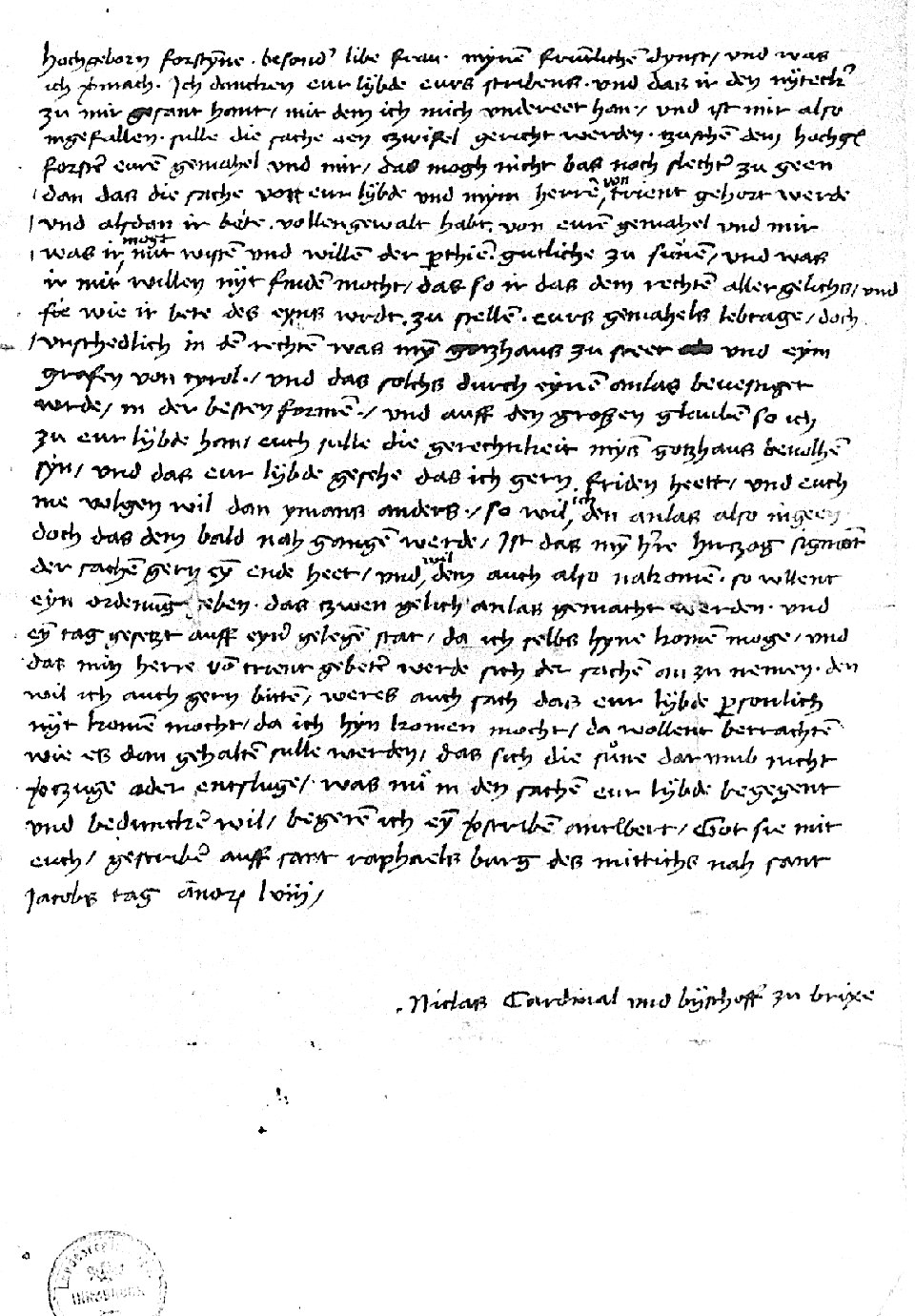 作品![]() 1458年7月26日、ニコラウス・フォン・クースが、オーストリア公ジークムントの妻、エレオノーレ公爵夫人に宛てた直筆の手紙。インスブルック、チロル州立公文書館 ニコラウスは50以上の著作を執筆し、そのうちの約4分の1は対話形式、残りは通常論文形式であった。さらに、約300の説教、そして膨大な書類や手紙も 残している。彼の著作は、その内容から3つの主要グループに分類できる。哲学と神学、教会と国家の理論、数学と自然科学である。1449年に彼が書いた短 い自伝は、特別な位置を占めている。彼は、クースの図書館にある2つの写本に、自身の著作の(ただし不完全な)コレクションを自ら編集した。 教会と国家の理論 クースの最も有名な著作の一つは、1433/34年にバーゼルで執筆された3冊からなる『カトリックの調和について』だ。調和という基本理念に基づき、ニ コラウスは第1巻で一般的な教会教義を展開し、第2巻で公会議の理論と教会および公会議の改革に関する考えを説明し、第3巻で国家論と帝国改革に関する考 えを述べている。バーゼル公会議で争われた紛争に関連して、他にも『聖公会議の権威が教皇の権威に優先することについて』(1433年)、『ボヘミア人の 誤謬に対する小論文』(1433年)、『フス派との紛争について』(1434年)、『総会議の議長権について』(1434年)などの著作がある。1433 年)、フス派との紛争に関する『一般公会議の議長権について』(1434年)などがある。彼は、1459年に『全面的な改革』という著作の中で、教会全体 の改革に関する自分の考えを述べている。 |
