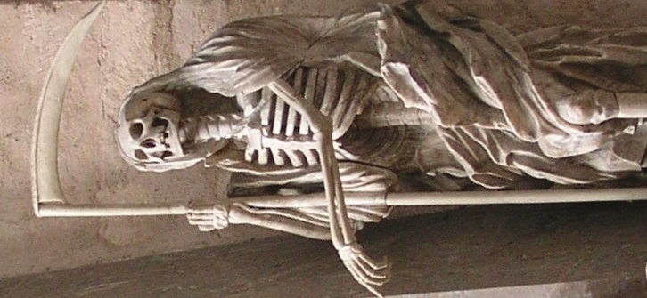 人間の骨格が包み布をまとい、大鎌を握りしめている姿で具現化された「死の像」が、ドイツ・トリーアのトリーア大聖堂にある。