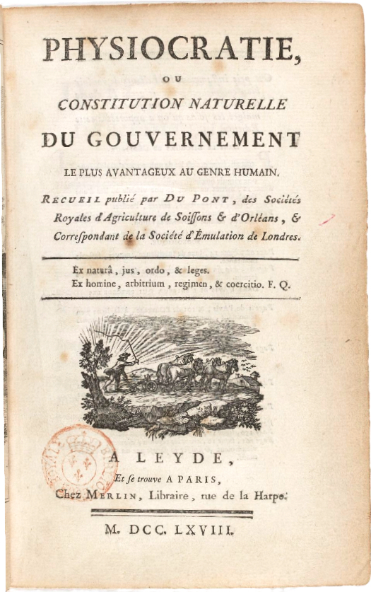 『重農主義、あるいは人類にとって最も有益な政府の自然憲法』の表紙/ フランソワ・ケネー、重農主義学派の共同創設者