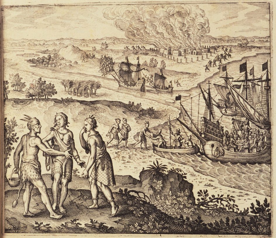 捕縛![]() ヨハン・テオドール・ド・ブリ作『ポカホンタスの誘拐』(1624年)。物語全体を描いた作品である。左下から始まる構図では、ポカホンタス(中央)が、 銅の釜を餌に差し出す首長イオパッスと、泣いているふりをするその妻に騙されている。右中央では、ポカホンタスが船に乗せられ、宴に招かれている。背景で は、ポトマック川からヨーク川へと舞台が移り、人質交換交渉が失敗すると入植者たちが先住民の村を襲撃し焼き払う。[29] ポカホンタスの捕縛は、1609年夏の終わりに始まったジェームズタウン入植者と先住民との紛争、第一次アングロ・ポウハタン戦争の文脈で発生した。 [30] 戦争初期、入植者たちはジェームズ川の河口と滝の両方を掌握した。その間、サミュエル・アーゴール大尉はパウハタン最高首長領の北部地域で先住民部族との 接触を続けた。ポタワメック族はポトマック川流域に住み、パウハタンに常に忠実とは限らなかった。彼らと共に暮らしていたのが、若い英国人通訳ヘンリー・ スペルマンである。1613年3月、アーゴールはポカホンタスがパタウォメック族の村パサパタンジーを訪れ、首長イオパスス(ジャパゾウスとも呼ばれる) の保護下で暮らしていることを知った。[31] スペルマンの通訳を得て、アーガールはイオパススに圧力をかけ、植民地側とパウハタン族に対する同盟を約束することで、ポカホンタスの捕獲への協力を迫っ た。[31] イオパススは妻たちの協力を得て、ポカホンタスを騙してアーガールの船「トレジャラー号」に乗船させ、身代金目的で彼女を拘束した。要求内容は、彼女の父 が拘束している植民地側の捕虜の解放と、盗まれた様々な武器や道具の返還であった。[32] 一年間に及ぶ身代金交渉の間、ポカホンタスは現在のバージニア州チェスターフィールド郡にあるヘンリカス英人入植地に拘束されていた。入植者のラルフ・ハ モアが「並外れた礼遇」(つまり良く扱われたという意味)を受けたと記しているものの、彼女の生活についてはほとんど知られていない。[33] リンウッド・「リトル・ベア」・カスタローは、ポカホンタスがレイプされたとする口承の伝承に言及している。ヘレン・ラウントリーは、「他の歴史家たち は、そのような口承の伝承が残っていることを争い、ポカホンタスに対する虐待は、ポウハタンとの交渉におけるイギリス側の利益に反するだろうと主張してい る」と反論している。休戦が宣言されていたが、インディアンは依然としてイギリス人よりも数で圧倒的に優勢であり、入植者たちは報復を恐れていた」と反論 している。この頃、ヘンリカスの牧師アレクサンダー・ウィテカーはポカホンタスにキリスト教を教え、彼女の英語力向上を支援した。洗礼を受けた彼女は、キ リスト教の名前「レベッカ」を名乗った。 1614年3月、パムンキー川で数百人の入植者とポウハタン族の男たちとの間で暴力的な対立が激化し、入植者たちはポウハタンの首都マッチコットで先住民 の長老たちの一団と遭遇した。ポウハタンが到着すると、入植者たちはポカホンタスに部族と話し合うことを許可し、彼女はポウハタンを「古い剣や銃、斧より も価値が低い」と叱責したと伝えられている。彼女は「自分を愛してくれる」入植者たちと共に生きることを選んだと語った。[36] 最初の結婚の可能性 マッタポニ族の伝承によれば、ポカホンタスの最初の夫はパタウォメック族の首長ジャパザウズの弟コクームであり、1613年に妻が捕らえられた後、コクー ムは入植者たちによって殺害されたとされる。[37] 現代のパタウォメック族は、ポカホンタスとコカムの間にカ・オキーという娘がおり、父の死と母の拉致後、パタウォメック族に育てられたと信じている。 [38] コクームの正体、所在、そして存在そのものは、何世紀にもわたり学者の間で広く議論されてきた。英語文書で「コクーム」に言及しているのは、ウィリアム・ ストラッチーが1616年頃に記した「ポカホンタスは『コクームという名の私兵隊長』と結婚して2年間暮らしていた」という短い記述だけである。[39] ポカホンタスは1614年にジョン・ロルフと結婚しており、それ以前の夫を示唆する記録は一切存在しない。このため、ストラッチーが誤ってロルフ自身を指 し、その記述が後にパウハタンの部下の一人と誤解されたのではないかと指摘する者もいる。[40] |