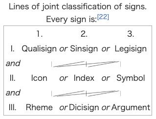 記号の共同分類の線。 あらゆる記号は: ![]() 異なる三区分に属する記号のクラスの中には(全てではないが)互いに交差するものがある。例えば、質的記号は常に図像であり、指示記号でも記号でも決して ない。彼は、これら三つの普遍的な三区分を通じて論理的に定義可能な記号のクラスは十種類のみだと主張した[23]。さらに、そのような普遍的な三区分が 他にも存在すると考えていた。また、一部の記号は具現化するために他の記号を必要とする。例えば「the」という単語のような記号類(類型とも呼ばれる) は、表現されるために「the」という単語の個々の使用例のような記号現(トークンとも呼ばれる)に具現化される必要がある。別の結合形態として付着また は組み込みがある:指示記号は表象記号や記号に付着したり組み込まれたりする。 パースは、ラベルや説明文、その他の付随する指標から切り離されたアイコンを「仮指標(hypoicon)」と呼び、これを三つのクラスに分類した: (a) 単純な性質に依存する「イメージ(image)」、 (b) 図式。主に二項関係(あるいはそう見なされる関係)の内部関係が、類推によって何かの関係を表す。(c) 隠喩。他の何かにおける並行性を表すことで、記号の代表性を表す。[24] 図式は幾何学的でもよいし、代数式の配列から成ってもよい。あるいは「すべての__は___である」という一般的な形式であってもよく、あらゆる図式と同 様に論理的・数学的変換が可能である。 |