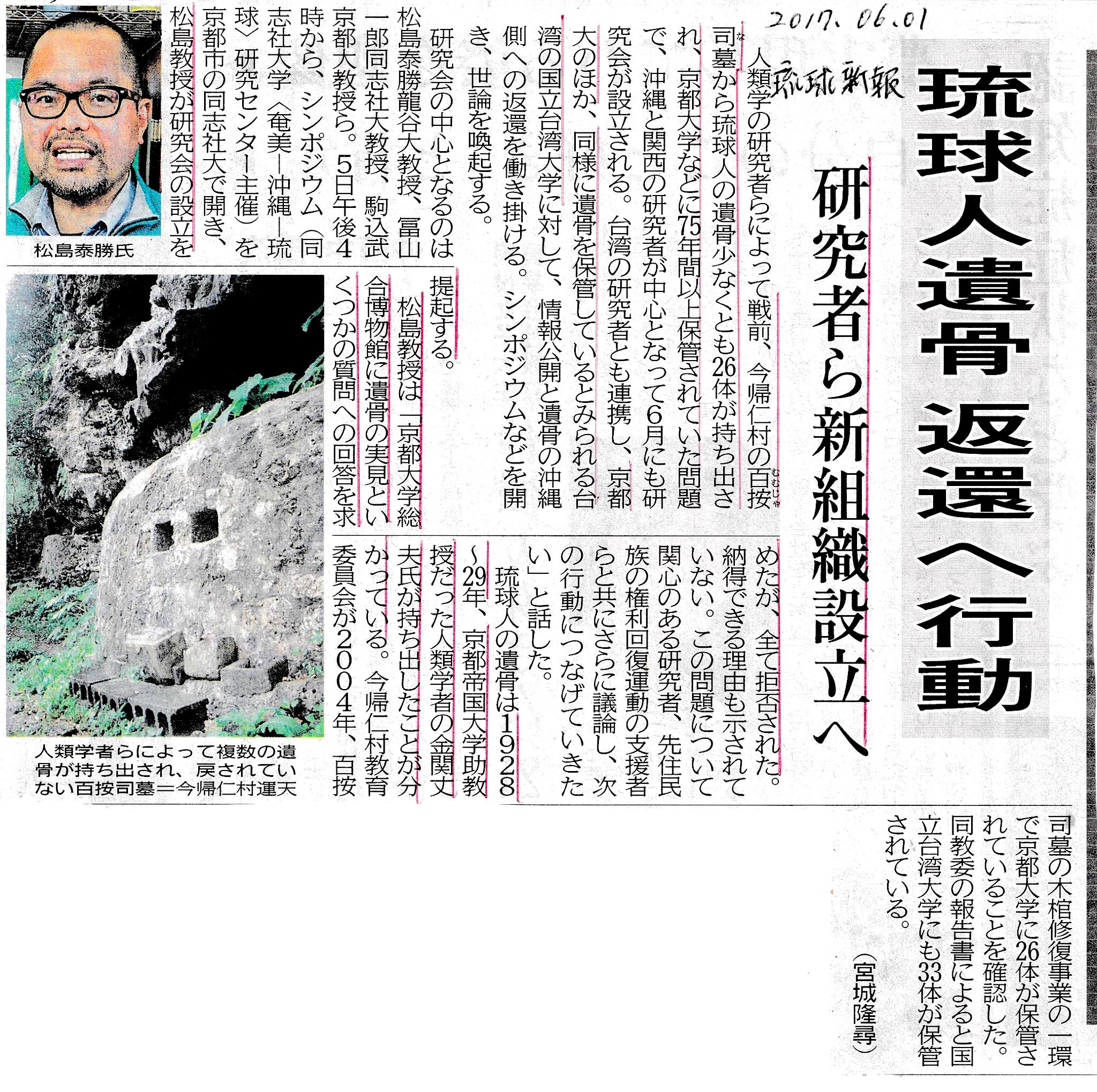 3月20日「昭和初期に旧帝国大学の人類学者らによって沖縄から持ち出された遺骨63体が20日までに、保 管されていた台湾の国立台湾大学から沖縄側に返還」。西原町の県立埋蔵文化財センターに保管される」琉球新報)松島泰勝代表らは 「遺骨が遺族の了解を得ずに持ち出されたとして違法性を指摘しており、遺骨の尊厳を回復するためには風葬地に戻して「再風葬」するよう求めている。ただ県 教委は「現在のところ再風葬は考えていない」と」返答する:琉球新 報)