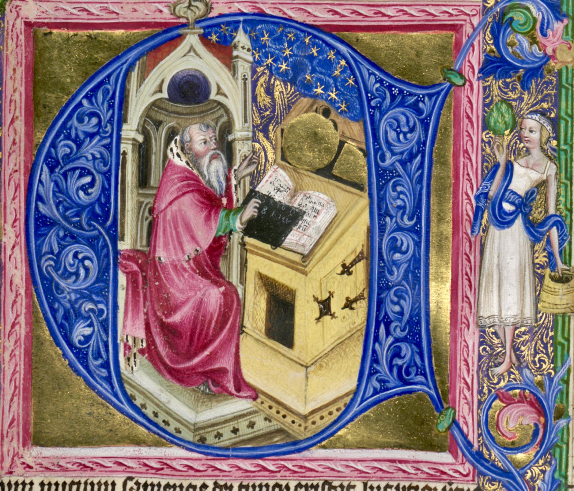 ![]() 装飾文字:D。装飾:アブラハム・イブン・エズラ(12世紀のアンドラ地方出身のラビ(トゥデラ、1092年頃 - カラオラ、1167年頃)。文法学者、翻訳者、詩人、聖書注釈者、哲学者、数学者、天文学者であり、中世の最も著名なラビの一人と見なされている。この装 飾文字では、彼は書斎で、書見台の前、開かれた本と石板を前にして描かれている。 彼の向かいには、オーブンでパンを焼いている女中がいる。 アブラハム・イブン・エズラによる占星術の論文の冒頭のページ。 |
