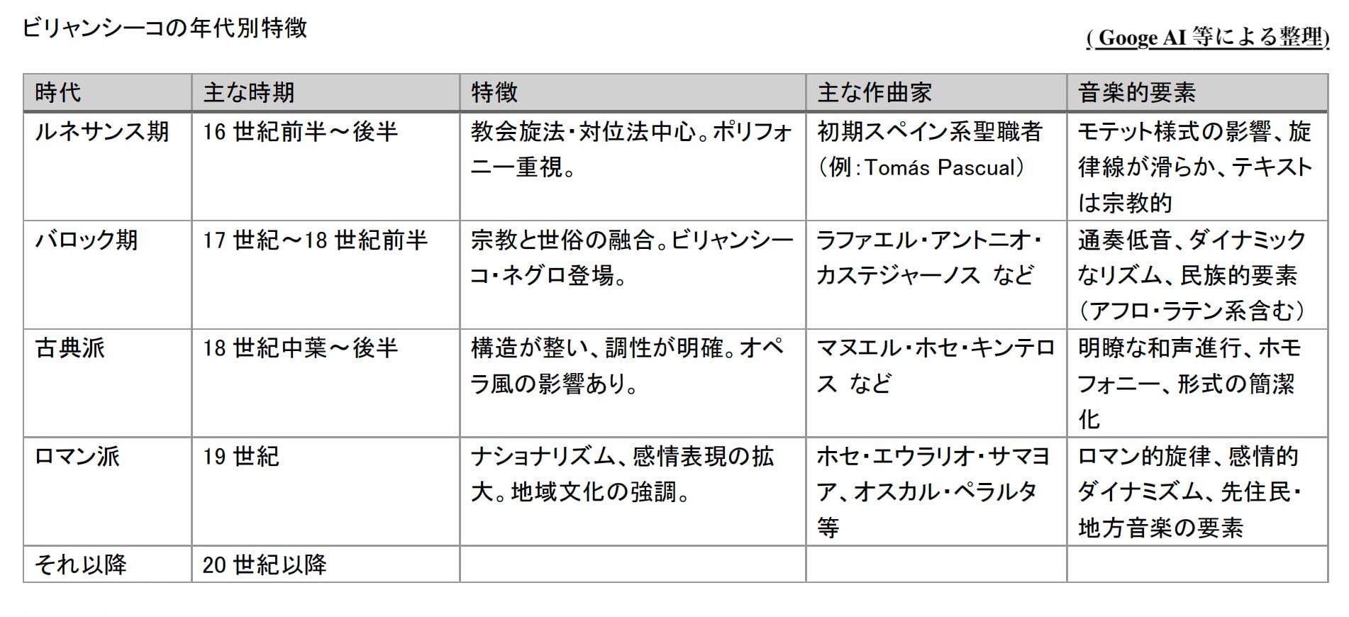 ☆ ビリャンシーコは、スペイン黄金世紀に盛んになった。詩はセヘル(アル・アンダルスでうまれた短詩)と関係があると言われる。素朴なマリア賛歌、クリスマ ス賛歌、恋歌や舞踏歌など、 多岐にわたる。作曲者不明のものが多いが、ファン・デル・エンシーナやファン・バスケスなどの作曲の作品もある。