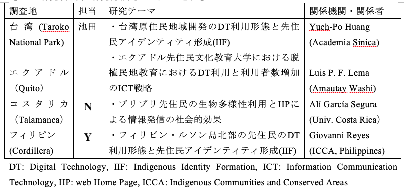 影響だけでなく、現地社会の先住民の側の主体的な関与も大きな影響を与えるので、固有の社会背景についての情報収集は不可欠だ。 本研究は、研究班のメンバーが知悉しているフィールドと研究協力者のネットワーク形成によるインタビューと現地調査にもとづく実践とも言える。その対象 は、台湾におけるエコツーリズム開発を中心としたSDGs地域開発、南米エクアドルにある先住民文化教育大学 Amautay Washi の教育実践、コスタリカでNが継続して調査をおこなっているブリブリ先住民居住区、そしてYを中心としたフィリピン先住民NGO団体(ICCAs)を中心 とする計画である。その統一した研究テーマは、地域開発のDT利用形態と先住民アイデンティティ形成(IIF)ならびに、先住民文化教育大学におけるDT 教育の事例分析、および先住民居住区における生態的知識(Traditional Knowledge, TK)の広報戦略とその実際のアウトカム評価(=ICT教育一般における質的な評価指標を本研究用に流用するために独自に開発する)である。 ![]() |