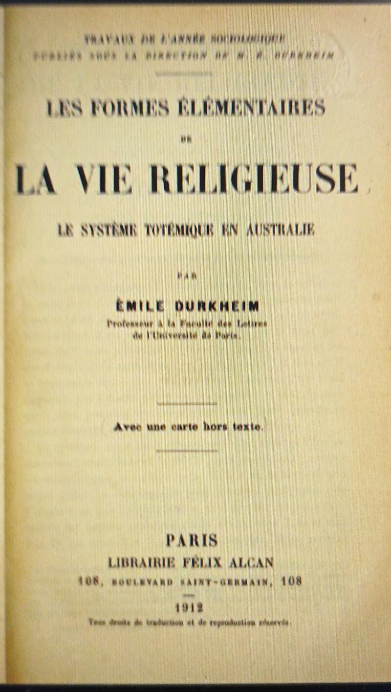 Australie)は、1912年に出版されたエミール・デュルケムの著書である。 宗教の本質の問題を扱っている。この著作でデュルケムは、宗教の本質的な中核要素として、社会的結束と社会的アイデンティティを確立する宗教の機能を明ら かにすることで、機能主義的な宗教観の基礎を築いた。デュルケームに従って、宗教社会学の個々の代表者は、さまざまな社会でそのような機能を果たすものす べてを宗教として解釈している。他方、宗教の実質的な概念もあり、これは宗教を特定の内容に関連する特徴(超越性の観念、祭司の役割の発展など)の観点か ら定義している。 |