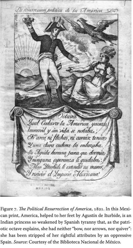 Figure 7. The Political Resurrection of America, 1821. In this Mexican print, America, helped to her feet by Agustín de Iturbide, is an Indian princess so weakened by Spanish tyranny that, as the patriotic octave explains, she had neither “bow, nor arrows, nor quiver”: she has been stripped of her rightful attributes by an oppressive Spain. Source: Courtesy of the Biblioteca Nacional de México. |