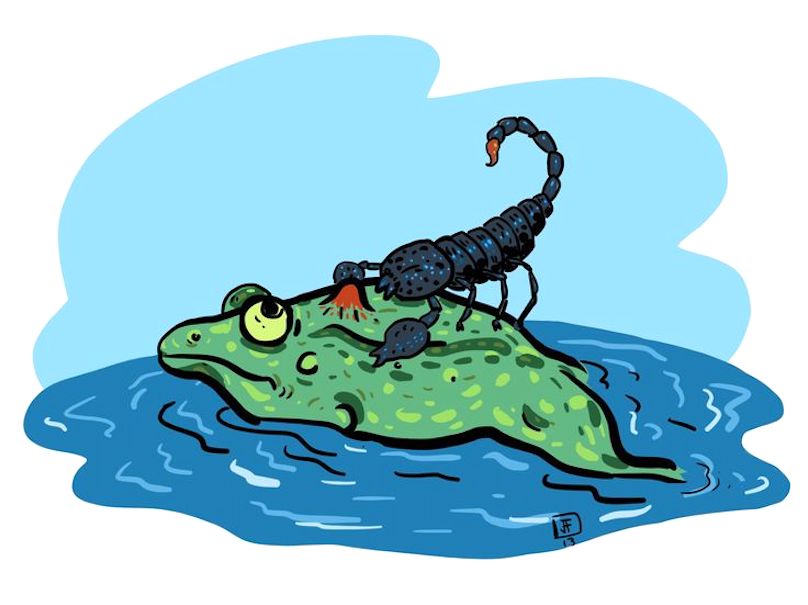 「あ る時、サソリが川を渡ろうとして、カエルに渡してくれるよう頼んだ。カエルは『だめだ。君を背負ったところで僕は君に刺されて死んでしまう』と断った。サ ソリは言い返す。『何て理屈の通らない言い草だ。君が死んだら、俺まで溺れてしまうだろう』そう言われてカエルは納得し、サソリを背負って川を渡り始め た。ところが川の真ん中で、カエルは背中に痛みを感じ刺されたことを知った。『理屈だって!』サソリと共に沈みながら、カエルは叫ぶ。『理屈も何もない じゃないか!』するとサソリは言った。『分かってはいるけれどやめられない。それが俺の性(さが)なんだ…』」※この挿話は、オーソン・ウェルズの映画 『ミスター・アーカディン』(1955)からの引用