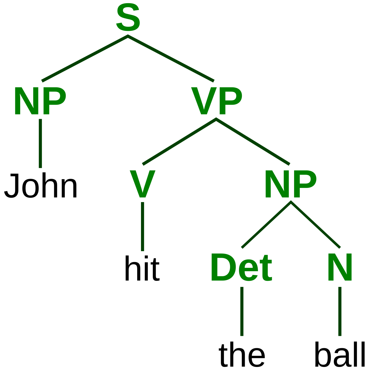 Phrasal semantics Phrasal semantics studies the meaning of sentences. It relies on the principle of compositionality to explore how the meaning of complex expressions arises from the combination of their parts.[59][e] The different parts can be analyzed as subject, predicate, or argument. The subject of a sentence usually refers to a specific entity while the predicate describes a feature of the subject or an event in which the subject participates. Arguments provide additional information to complete the predicate.[61] For example, in the sentence "Mary hit the ball", Mary is the subject, hit is the predicate, and the ball is an argument.[61] A more fine-grained categorization distinguishes between different semantic roles of words, such as agent, patient, theme, location, source, and goal.[62] ![]() Diagram of a parse tree Parse trees, like the constituency-based parse tree, show how expressions are combined to form sentences. Verbs usually function as predicates and often help to establish connections between different expressions to form a more complex meaning structure. In the expression "Beethoven likes Schubert", the verb like connects a liker to the object of their liking.[63] Other sentence parts modify meaning rather than form new connections. For instance, the adjective red modifies the color of another entity in the expression red car.[64] A further compositional device is variable binding, which is used to determine the reference of a term. For example, the last part of the expression "the woman who likes Beethoven" specifies which woman is meant.[65] Parse trees can be used to show the underlying hierarchy employed to combine the different parts.[66] Various grammatical devices, like the gerund form, also contribute to meaning and are studied by grammatical semantics.[67] |