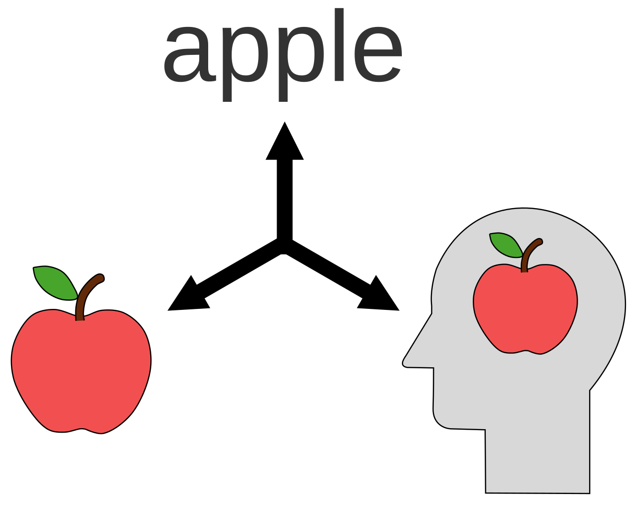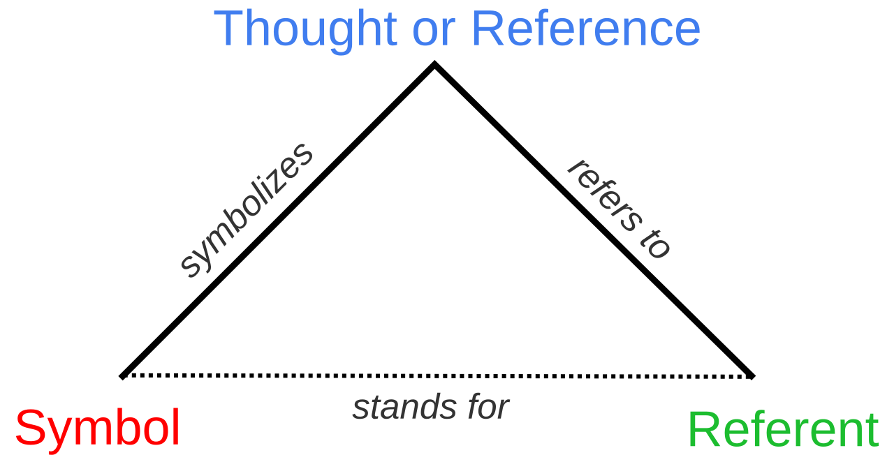 記号論の三角形![]() 記号論の三角形の図 記号論の三角形は、言語(記号)と世界(指称対象)の関係が、言語使用者(思考または参照)によって媒介される仕組みを説明することを目的としている。 記号論の三角形、別名意味の三角形は、言語、言語使用者、世界(モデル上では記号、思考または参照、指称対象として表される)の関係を説明するモデルであ る。記号は言語的表象であり、発話形態または記述形態のいずれかである。このモデルの核心は、言語表現とそれが指す対象との間に直接的な関係は存在しない という点にある。これは従来の二項関係モデルが想定していたものとは異なる。図式では記号と指称対象の間の点線でこれが表現されている。[40] 代わりにこのモデルは、両者の関係は第三の要素を介して成立すると主張する。例えば「りんご」という語は果物の種類を表すが、この文字列と対応する実体と の間には直接的な繋がりはない。関係は言語使用者の心を通じて間接的にのみ確立される。言語使用者が記号を見ると、それが心象や概念を喚起し、それによっ て物理的対象とのつながりが確立される。このプロセスは、言語使用者が事前に記号の意味を学習している場合にのみ可能である。特定の記号の意味は、特定の 言語の慣習によって規定される。同じ記号が、ある言語ではある対象を指し、別の言語では別の対象を指し、また別の言語では何の対象も指さない場合がある。 [40] |