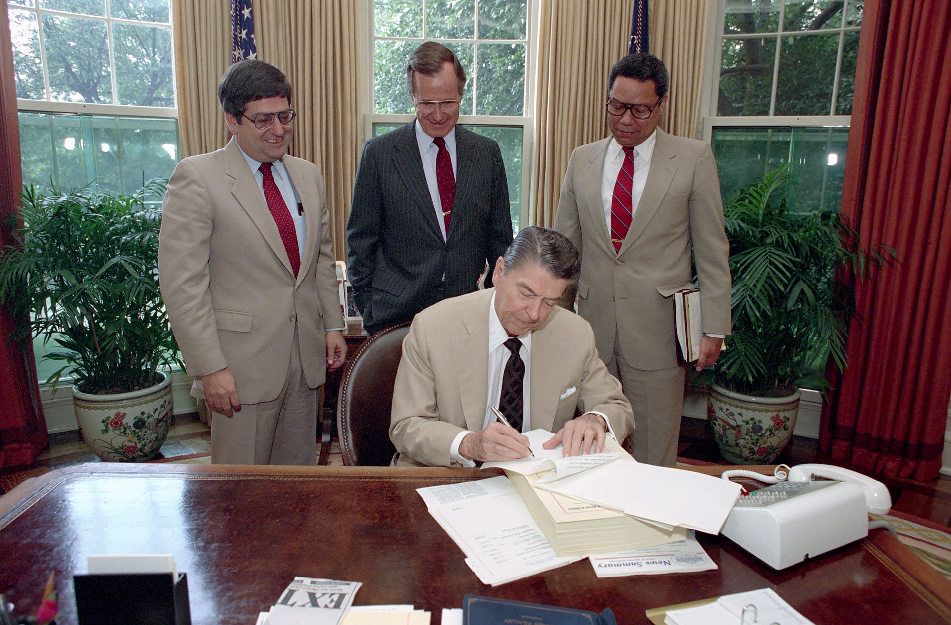 ![]() アメリカ合衆国大統領ロナルド・レーガンが法案の拒否権行使に署名する |